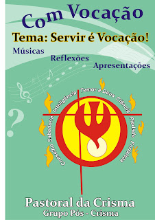 Por durante todo o mês de Agosto, a Pastoral da Crisma realizará o com vocação, que será um momento de reflexão sobre a nossa vocação como cristão batizado. Esta ação será realizada em alguns setores de Nossa Paróquia, envolvendo do modo específico os Jovens já crismados. Porém, toda a comunidade também é convidada a participar. Nosso primeiro momento será na comunidade João Paulo II dia 06/08/11 as 19:00 h. Toda a juventude e comunidades adjacentes são convidadas a participarem.
